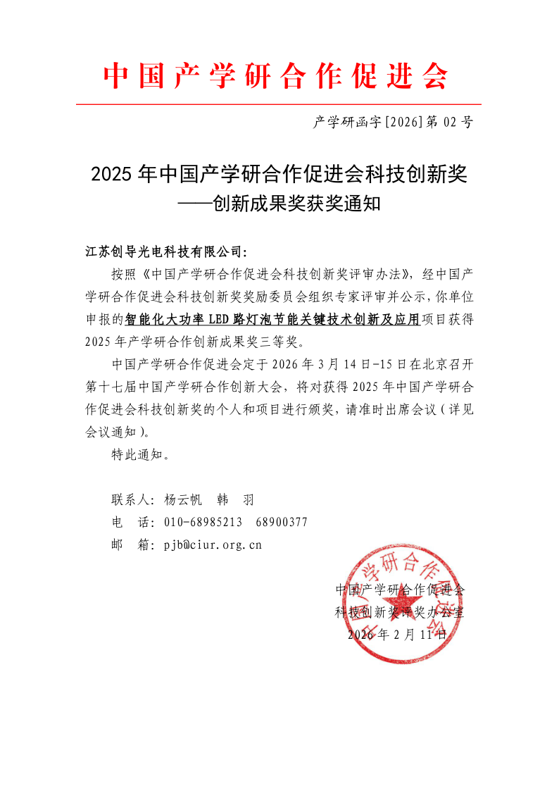 近日,2025年度中国产学研合作促进会科技创新奖评审结果正式公布。由我院联合江苏创导光电科技有限公司、宿迁创导新能源科技有限公司共同完成的“智能化大功率LED路灯泡节能关键技术创新及应用”项目,荣获科技创新奖—创新成果奖三等奖。这是对我院在光电节能领域产学研协同创新与产业化能力的高度认可。