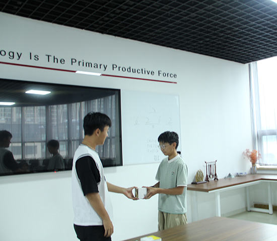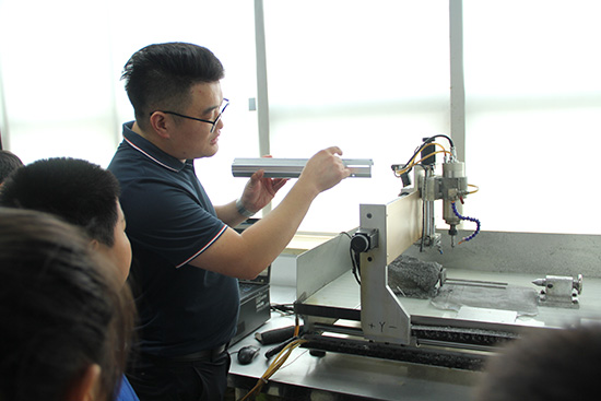 活动开始,周峰部长带领学生们参观了科技展厅、实验室及小试车间。简单介绍了CNC数控车床、激光切割机、SMT产线等设备的工作原理和操作方法,近距离的演示让同学们对这些现代化设备及内含的科技产生浓厚的兴趣。